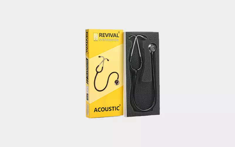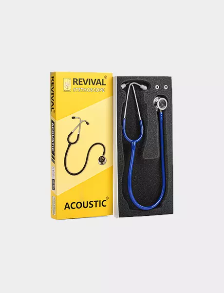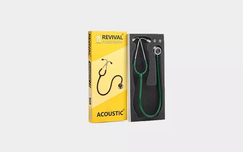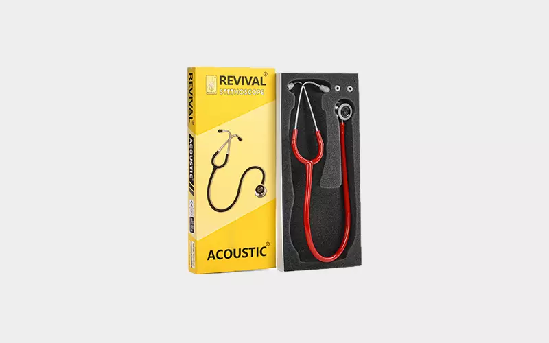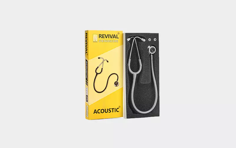 Revival® Acoustic® stainless-steel dual head stethoscope doctors, nurses, EMT and medical students for use in critical and non-critical care environments with latex free tubing along with one pair of standard sized extra soft sealing ear knobs and one additional pair of large sized extra soft sealing ear knobs for a comfortable fit as per individual requirements.