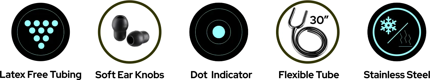 Anatomically designed high-quality stainless-steel binaural frame which is durable and easy to maintain. Latex free lumen tubing with enhanced length for ease of use Removable extra soft sealing ear knobs sterilizable with hot water or soap solution.